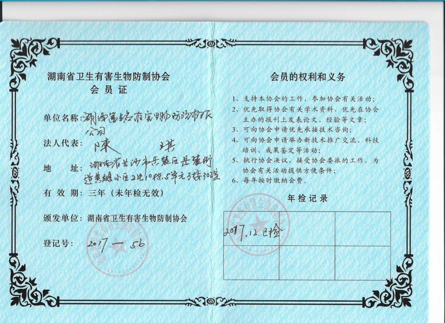 湖南省卫生有害生物防制协会会员证