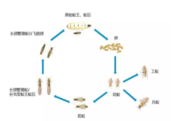 绝大多数白蚁首先由卵开始孵化,变为幼蚁,幼蚁经过分化,变为兵蚁、工蚁和若蚁,若蚁进一步发展,变为补充型蚁王蚁后和长翅繁殖蚁,长翅繁殖蚁经过分飞脱翅,变为原始蚁王蚁后。
