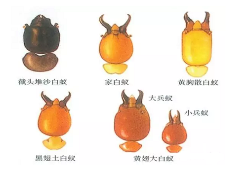 另外,根据兵蚁的头部形态特征,也可以识别白蚁的不同种类。因为兵蚁的主要职能是警卫和战斗,因此为了适应该职能,兵蚁形态发生了巨大的变化,尤其是头部和胸部。