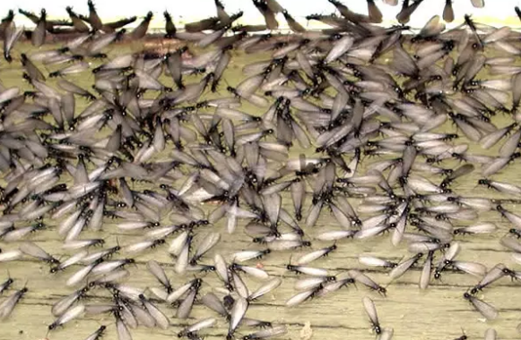 *白蚁的分飞(婚飞):每年3~6月份(不同种类约有差异)为白蚁分飞繁殖期,在气候适宜的某一天的某一时刻,成熟巢穴中的繁殖蚁会离开巢穴自立门户,配对繁殖,发展新巢群。